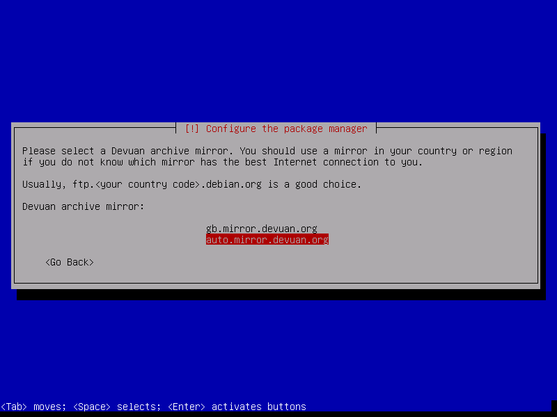 5. Select a package repository mirror; auto.mirror.devuan.org specifically should be chosen in this case; specify proxy settings to connect to the repository, if applicable