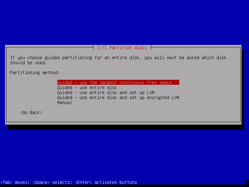 8. Partition the disk according to your preferences. Note that the option to use the largest continuous space will leave existing partitions untouched.
